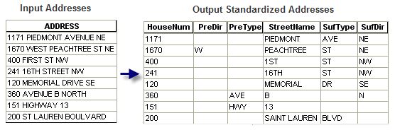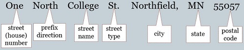 street (house) number, prefix direction, prefix type, street name, street type, suffix direction, and zone information such as city, state, and ZIP Code.